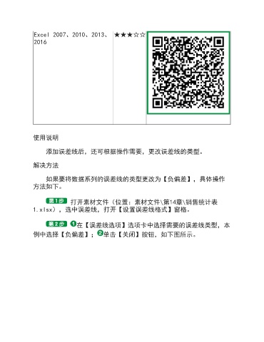Excel 2007、2010、2013、 ★★★☆☆ 2016 使用说明 添加误差线后,还可根据操作需要,更改误差线的类型。 解决方法 如果要将数据系列的误差线的类型更改为【负偏差】,具体操作 方法如下。 打开素材文件(位置:素材文件\第14章\销售统计表 1.xlsx),选中误差线,打开【设置误差线格式】窗格。 在【误差线选项】选项卡中选择需要的误差线类型,本 例中选择【负偏差】; 单击【关闭】按钮,如下图所示。