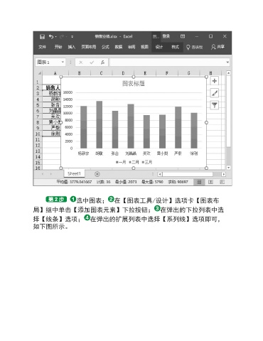 选中图表; 在【图表工具/设计】选项卡【图表布 局】组中单击【添加图表元素】下拉按钮; 在弹出的下拉列表中选 择【线条】选项; 在弹出的扩展列表中选择【系列线】选项即可, 如下图所示。