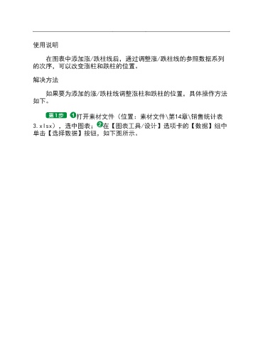 使用说明 在图表中添加涨/跌柱线后,通过调整涨/跌柱线的参照数据系列 的次序,可以改变涨柱和跌柱的位置。 解决方法 如果要为添加的涨/跌柱线调整涨柱和跌柱的位置,具体操作方法 如下。 打开素材文件(位置:素材文件\第14章\销售统计表 3.xlsx),选中图表; 在【图表工具/设计】选项卡的【数据】组中 单击【选择数据】按钮,如下图所示。