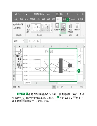 弹出【选择数据源】对话框,在【图例项(系列)】栏 中的列表框中选择某个数据系列,如2017; 单击【上移】 或【下 移】按钮 调整顺序,如下图所示。