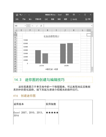 14.3 迷你图的创建与编辑技巧 迷你图是显示于单元格中的一个微型图表,可以直观地反应数据 系列中的变化趋势,接下来就为读者介绍相关的操作技巧。 416 创建迷你图 适用版本 实用指数 Excel 2007、2010、2013、 ★★★★★ 2016