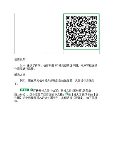 使用说明 Excel提供了折线、柱形和盈亏3种类型的迷你图,用户可根据操 作需要进行选择。 解决方法 例如,要在单元格中插入折线类型的迷你图,具体操作方法如 下。 打开素材文件(位置:素材文件\第14章\销售业 绩.xlsx),选中要显示迷你图的单元格; 在【插入】选项卡的【迷 你图】组中选择要插入的迷你图类型,本例选择【折线】,如下图所 示。