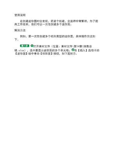 使用说明 在创建迷你图时会发现,若逐个创建,会显得非常繁琐,为了提 高工作效率,我们可以一次性创建多个迷你图。 解决方法 例如,要一次性创建多个柱形类型的迷你图,具体操作方法如 下。 打开素材文件(位置:素材文件\第14章\销售业 绩.xlsx),选中要显示迷你图的多个单元格; 在【插入】选项卡的 【迷你图】组中单击【柱形图】按钮,如下图所示。