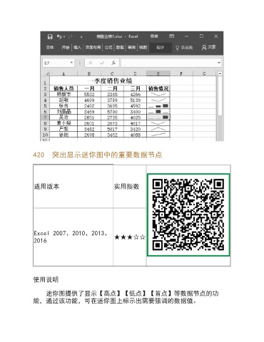 420 突出显示迷你图中的重要数据节点 适用版本 实用指数 Excel 2007、2010、2013、 ★★★☆☆ 2016 使用说明 迷你图提供了显示【高点】【低点】【首点】等数据节点的功 能,通过该功能,可在迷你图上标示出需要强调的数据值。