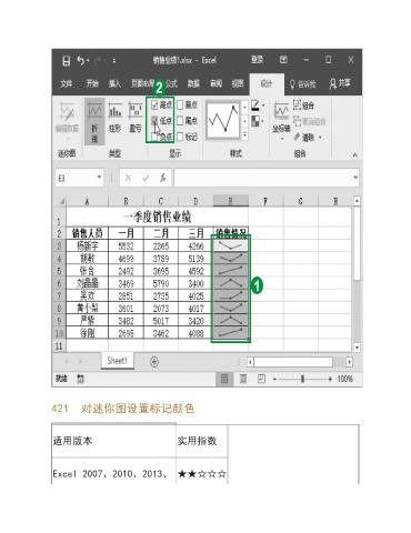421 对迷你图设置标记颜色 适用版本 实用指数 Excel 2007、2010、2013、 ★★☆☆☆