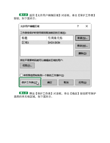 返回【允许用户编辑区域】对话框,单击【保护工作表】 按钮,如下图所示。 弹出【保护工作表】对话框,单击【确定】按钮即可保护 选择的单元格区域,如下图所示。