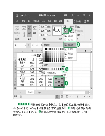 保持迷你图的选中状态,在【迷你图工具/设计】选项 卡【样式】组中单击【标记颜色】下拉按钮 ; 在弹出的下拉列表 中选择【低点】选项; 在弹出的扩展列表中为低点选择颜色,如下 图所示。
