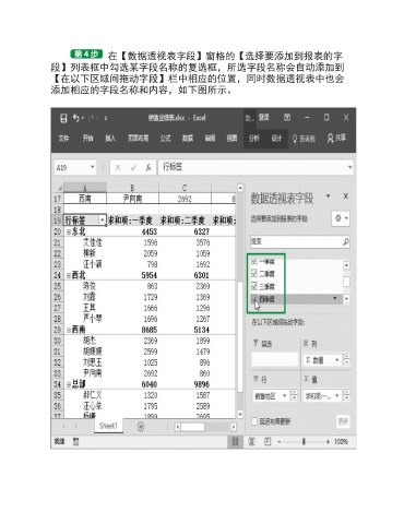 在【数据透视表字段】窗格的【选择要添加到报表的字 段】列表框中勾选某字段名称的复选框,所选字段名称会自动添加到 【在以下区域间拖动字段】栏中相应的位置,同时数据透视表中也会 添加相应的字段名称和内容,如下图所示。