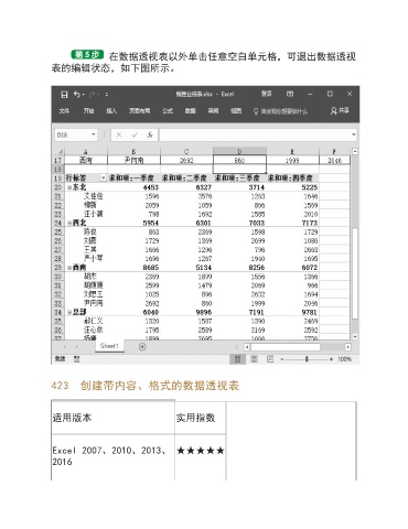 在数据透视表以外单击任意空白单元格,可退出数据透视 表的编辑状态,如下图所示。 423 创建带内容、格式的数据透视表 适用版本 实用指数 Excel 2007、2010、2013、 ★★★★★ 2016