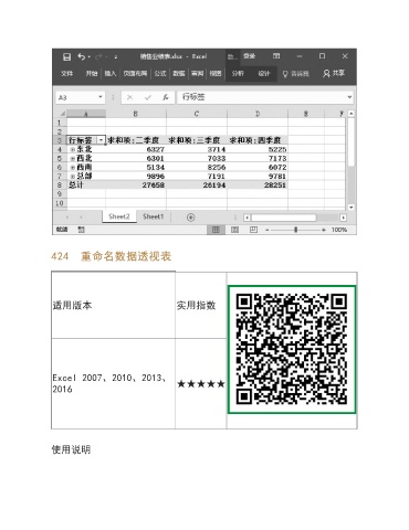 424 重命名数据透视表 适用版本 实用指数 Excel 2007、2010、2013、 2016 ★★★★★ 使用说明