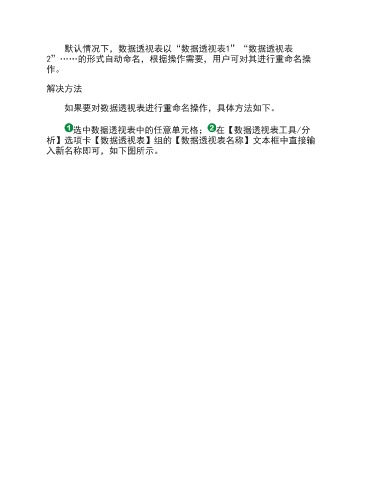 默认情况下,数据透视表以“数据透视表1”“数据透视表 2”……的形式自动命名,根据操作需要,用户可对其进行重命名操 作。 解决方法 如果要对数据透视表进行重命名操作,具体方法如下。 选中数据透视表中的任意单元格; 在【数据透视表工具/分 析】选项卡【数据透视表】组的【数据透视表名称】文本框中直接输 入新名称即可,如下图所示。