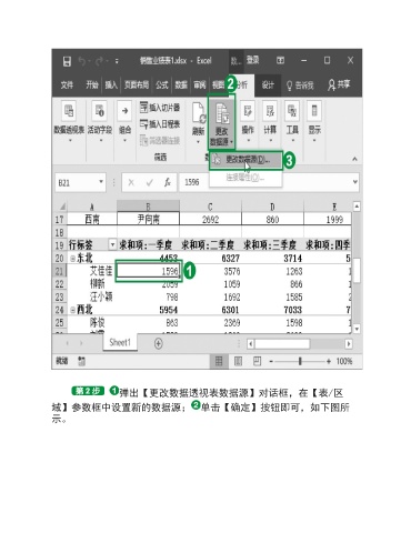弹出【更改数据透视表数据源】对话框,在【表/区 域】参数框中设置新的数据源; 单击【确定】按钮即可,如下图所 示。