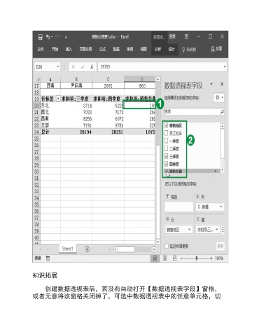 知识拓展 创建数据透视表后,若没有自动打开【数据透视表字段】窗格, 或者无意将该窗格关闭掉了,可选中数据透视表中的任意单元格,切
