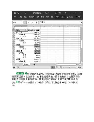 创建好透视表后,我们会发现表格数据非常凌乱,此时 就需要调整字段位置了。在【数据透视表字段】窗格的【选择要添加 到报表的字段】列表框中,使用鼠标右键单击【商品类别】字段选 项; 在弹出的快捷菜单中选择【添加到列标签】命令,如下图所 示。