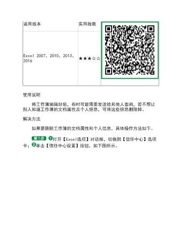 适用版本 实用指数 Excel 2007、2010、2013、 2016 ★★★☆☆ 使用说明 将工作簿编辑好后,有时可能需要发送给其他人查阅,若不想让 别人知道工作簿的文档属性及个人信息,可将这些信息删除掉。 解决方法 如果要删除工作簿的文档属性和个人信息,具体操作方法如下。 打开【Excel选项】对话框,切换到【信任中心】选项 卡; 单击【信任中心设置】按钮,如下图所示。
