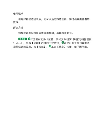 使用说明 创建好数据透视表后,还可以通过筛选功能,筛选出需要查看的 数据。 解决方法 如果要在数据透视表中筛选数据,具体方法如下。 打开素材文件(位置:素材文件\第15章\家电销售情况 1.xlsx),单击【品牌】右侧的下拉按钮; 在弹出的下拉列表中选 择要筛选的品牌,如【海尔】; 单击【确定】按钮,如下图所示。