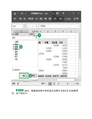 此时,数据透视表中将仅显示品牌为【海尔】的销售情 况,如下图所示。
