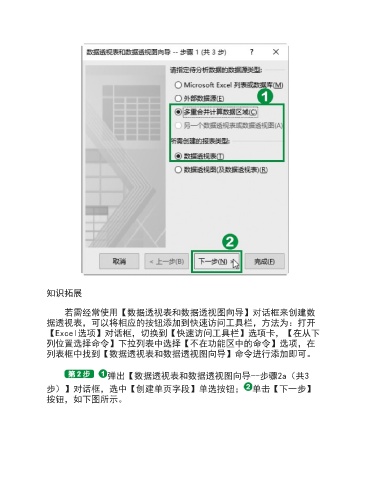 知识拓展 若需经常使用【数据透视表和数据透视图向导】对话框来创建数 据透视表,可以将相应的按钮添加到快速访问工具栏,方法为:打开 【Excel选项】对话框,切换到【快速访问工具栏】选项卡,【在从下 列位置选择命令】下拉列表中选择【不在功能区中的命令】选项,在 列表框中找到【数据透视表和数据透视图向导】命令进行添加即可。 弹出【数据透视表和数据透视图向导--步骤2a(共3 步)】对话框,选中【创建单页字段】单选按钮; 单击【下一步】 按钮,如下图所示。
