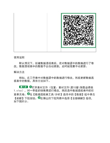 使用说明 默认情况下,创建数据透视表后,若对数据源中的数据进行了修 改,数据透视表中的数据不会自动更新,此时就需要手动更新。 解决方法 例如,在工作表中对数据源中的数据进行修改,然后更新数据透 视表中的数据,具体方法如下。 打开素材文件(位置:素材文件\第15章\销售业绩表 1.xlsx),对一季度的销售量进行修改,然后选中数据透视表中的任 意单元格; 在【数据透视表工具/分析】选项卡的【数据】组中单击 【刷新】下拉按钮; 在弹出的下拉列表中选择【全部刷新】选项, 如下图所示。