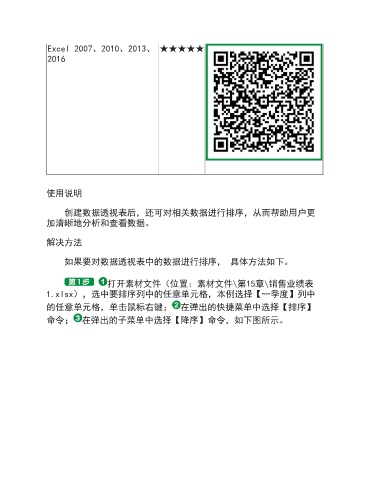 Excel 2007、2010、2013、 ★★★★★ 2016 使用说明 创建数据透视表后,还可对相关数据进行排序,从而帮助用户更 加清晰地分析和查看数据。 解决方法 如果要对数据透视表中的数据进行排序, 具体方法如下。 打开素材文件(位置:素材文件\第15章\销售业绩表 1.xlsx),选中要排序列中的任意单元格,本例选择【一季度】列中 的任意单元格,单击鼠标右键; 在弹出的快捷菜单中选择【排序】 命令; 在弹出的子菜单中选择【降序】命令,如下图所示。