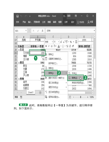 此时,表格数据将以【一季度】为关键字,进行降序排 列,如下图所示。