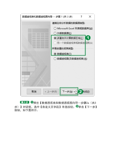 弹出【数据透视表和数据透视图向导--步骤2a(共3 步)】对话框,选中【自定义页字段】单选按钮; 单击【下一步】 按钮,如下图所示。