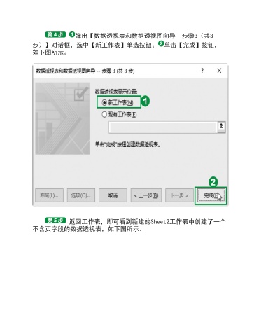弹出【数据透视表和数据透视图向导--步骤3(共3 步)】对话框,选中【新工作表】单选按钮; 单击【完成】按钮, 如下图所示。 返回工作表,即可看到新建的Sheet2工作表中创建了一个 不含页字段的数据透视表,如下图所示。