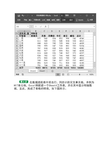 在数据透视表中双击行、列总计的交叉单元格,本例为 H17单元格,Excel将新建一个Sheet4工作表,并在其中显示明细数 据,至此,完成了表格的转换,如下图所示。