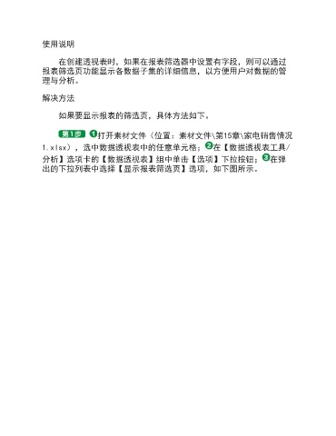 使用说明 在创建透视表时,如果在报表筛选器中设置有字段,则可以通过 报表筛选页功能显示各数据子集的详细信息,以方便用户对数据的管 理与分析。 解决方法 如果要显示报表的筛选页,具体方法如下。 打开素材文件(位置:素材文件\第15章\家电销售情况 1.xlsx),选中数据透视表中的任意单元格; 在【数据透视表工具/ 分析】选项卡的【数据透视表】组中单击【选项】下拉按钮; 在弹 出的下拉列表中选择【显示报表筛选页】选项,如下图所示。
