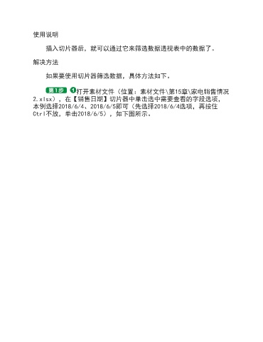 使用说明 插入切片器后,就可以通过它来筛选数据透视表中的数据了。 解决方法 如果要使用切片器筛选数据,具体方法如下。 打开素材文件(位置:素材文件\第15章\家电销售情况 2.xlsx),在【销售日期】切片器中单击选中需要查看的字段选项, 本例选择2018/6/4、2018/6/5即可(先选择2018/6/4选项,再按住 Ctrl不放,单击2018/6/5),如下图所示。