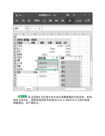 在【品牌】切片器中单击选中需要查看的字段选项,本例 选择【海尔】,选择完成后即可筛选出2018/6/4和2018/6/5海尔电器 销售情况,如下图所示。