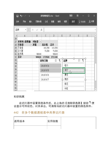 知识拓展 在切片器中设置筛选条件后,右上角的【清除筛选器】按钮 便 会显示可用状态,对其单击,可清除当前切片器中设置的筛选条件。 442 在多个数据透视表中共享切片器 适用版本 实用指数