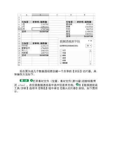 现在要为这几个数据透视表创建一个共享的【分区】切片器,具 体操作方法如下。 打开素材文件(位置:素材文件\第15章\奶粉销售情 况.xlsx),在任意数据透视表中选中任意单元格; 在【数据透视表 工具/分析】选项卡【筛选】组中单击【插入切片器】按钮,如下图所 示。