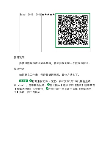 Excel 2013、2016 ★★★★★ 使用说明 要使用数据透视图分析数据,首先要先创建一个数据透视图。 解决方法 如果要在工作表中创建数据透视图,具体方法如下。 打开素材文件(位置:素材文件\第15章\销售业绩 表.xlsx),选中数据区域; 在【插入】选项卡的【图表】组中单击 【数据透视图】下拉按钮; 在弹出的下拉列表中选择【数据透视 图】选项,如下图所示。