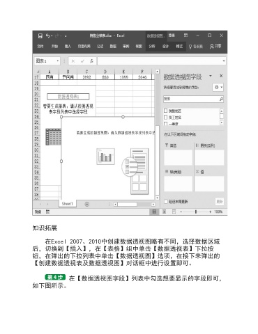 知识拓展 在Excel 2007、2010中创建数据透视图略有不同,选择数据区域 后,切换到【插入】,在【表格】组中单击【数据透视表】下拉按 钮,在弹出的下拉列表中单击【数据透视图】选项,在接下来弹出的 【创建数据透视表及数据透视图】对话框中进行设置即可。 在【数据透视图字段】列表中勾选想要显示的字段即可, 如下图所示。