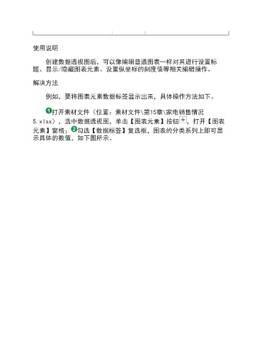 使用说明 创建数据透视图后,可以像编辑普通图表一样对其进行设置标 题、显示/隐藏图表元素、设置纵坐标的刻度值等相关编辑操作。 解决方法 例如,要将图表元素数据标签显示出来,具体操作方法如下。 打开素材文件(位置:素材文件\第15章\家电销售情况 5.xlsx),选中数据透视图,单击【图表元素】按钮 ,打开【图表 元素】窗格; 勾选【数据标签】复选框,图表的分类系列上即可显 示具体的数值,如下图所示。