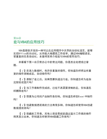 使重复的任务自动化。本章将简单介绍宏与VBA的使用技巧。