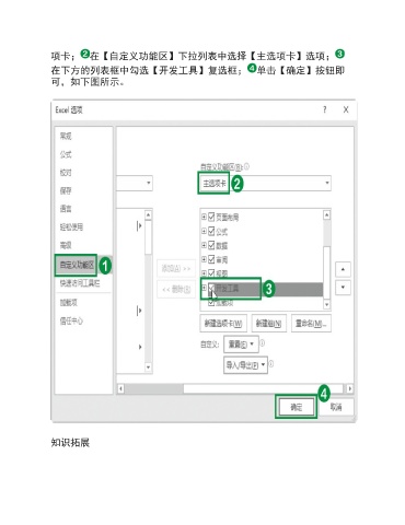项卡; 在【自定义功能区】下拉列表中选择【主选项卡】选项; 在下方的列表框中勾选【开发工具】复选框; 单击【确定】按钮即 可,如下图所示。 知识拓展