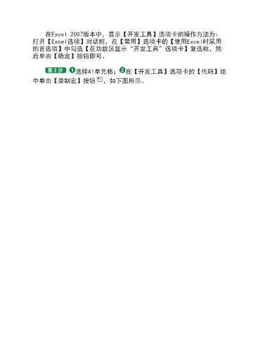 在Excel 2007版本中,显示【开发工具】选项卡的操作方法为: 打开【Excel选项】对话框,在【常用】选项卡的【使用Excel时采用 的首选项】中勾选【在功能区显示“开发工具”选项卡】复选框,然 后单击【确定】按钮即可。 选择A1单元格; 在【开发工具】选项卡的【代码】组 中单击【录制宏】按钮 ,如下图所示。