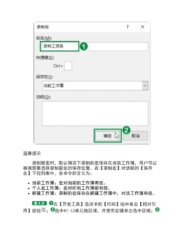 温馨提示 录制新宏时,默认情况下录制的宏保存在当前工作簿,用户可以 根据需要选择录制新宏的保存位置。在【录制宏】对话框的【保存 在】下拉列表中,各命令的含义为: 当前工作簿:宏对当前的工作簿有效。 个人宏工作簿:宏对所有工作簿都有效。 新建工作簿:录制的宏保存在新建工作簿中,对该工作簿有效。 在【开发工具】选项卡的【代码】组中单击【相对引 用】按钮 ; 选中A1:I2单元格区域,并使用右键单击选中区域;