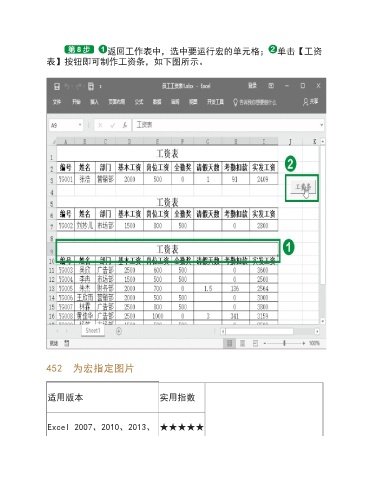 返回工作表中,选中要运行宏的单元格; 单击【工资 表】按钮即可制作工资条,如下图所示。 452 为宏指定图片 适用版本 实用指数 Excel 2007、2010、2013、 ★★★★★