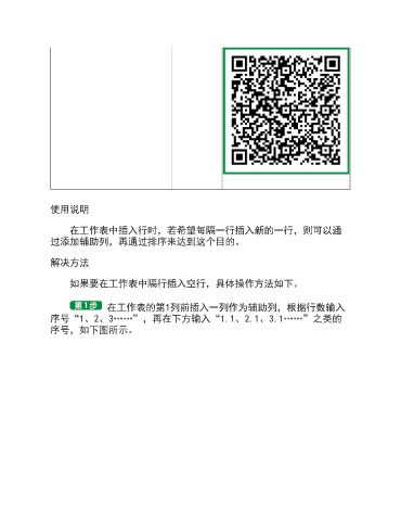 使用说明 在工作表中插入行时,若希望每隔一行插入新的一行,则可以通 过添加辅助列,再通过排序来达到这个目的。 解决方法 如果要在工作表中隔行插入空行,具体操作方法如下。 在工作表的第1列前插入一列作为辅助列,根据行数输入 序号“1、2、3……”,再在下方输入“1.1、2.1、3.1……”之类的 序号,如下图所示。