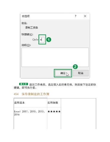 返回工作表后,选定插入宏的单元格,然后按下设定的快 捷键,即可执行宏。 454 保存录制宏的工作簿 适用版本 实用指数 Excel 2007、2010、2013、 ★★★★★ 2016