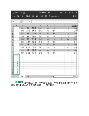 选择辅助列的序号单元格区域,单击【数据】选项卡【排 序和筛选】组中的【升序】按钮,如下图所示。