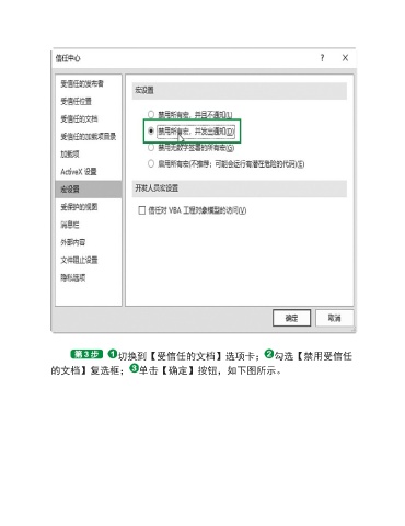 切换到【受信任的文档】选项卡; 勾选【禁用受信任 的文档】复选框; 单击【确定】按钮,如下图所示。