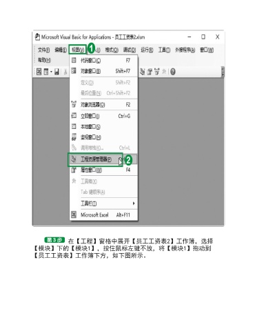 在【工程】窗格中展开【员工工资表2】工作簿,选择 【模块】下的【模块1】,按住鼠标左键不放,将【模块1】拖动到 【员工工资表】工作簿下方,如下图所示。
