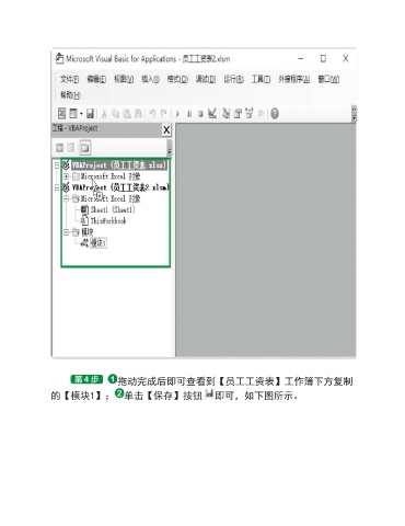 拖动完成后即可查看到【员工工资表】工作簿下方复制 的【模块1】; 单击【保存】按钮 即可,如下图所示。