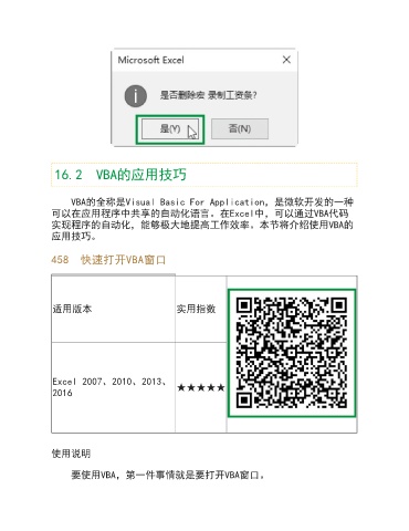 16.2 VBA的应用技巧 VBA的全称是Visual Basic For Application,是微软开发的一种 可以在应用程序中共享的自动化语言。在Excel中,可以通过VBA代码 实现程序的自动化,能够极大地提高工作效率。本节将介绍使用VBA的 应用技巧。 458 快速打开VBA窗口 适用版本 实用指数 Excel 2007、2010、2013、 2016 ★★★★★ 使用说明 要使用VBA,第一件事情就是要打开VBA窗口。