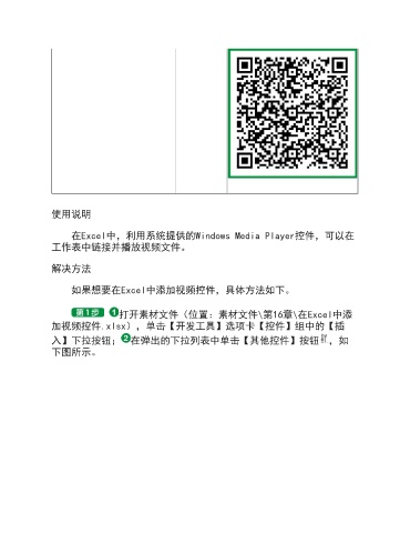 使用说明 在Excel中,利用系统提供的Windows Media Player控件,可以在 工作表中链接并播放视频文件。 解决方法 如果想要在Excel中添加视频控件,具体方法如下。 打开素材文件(位置:素材文件\第16章\在Excel中添 加视频控件.xlsx),单击【开发工具】选项卡【控件】组中的【插 入】下拉按钮; 在弹出的下拉列表中单击【其他控件】按钮 ,如 下图所示。