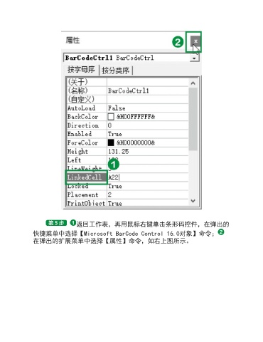 返回工作表,再用鼠标右键单击条形码控件,在弹出的 快捷菜单中选择【Microsoft BarCode Control 16.0对象】命令; 在弹出的扩展菜单中选择【属性】命令,如右上图所示。